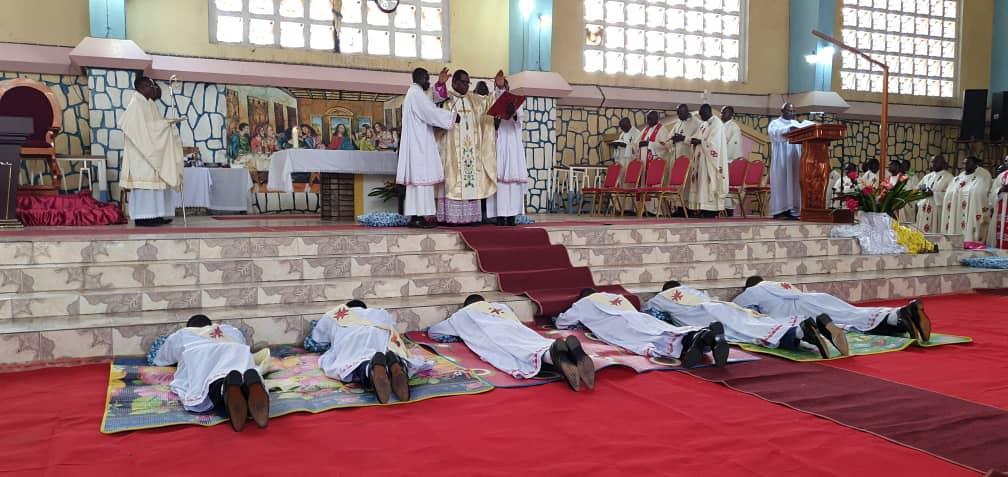 Le diocèse de Matadi vient de s'enrichir en ce 23e dimanche du temps ordinaire de l'année C, le 04 septembre 2022, de six nouveaux prêtres. En effet, c'est au cours de la messe qu'il a présidée à la paroisse Notre-Dame de Fatima dans le doyenné de Matadi que Mgr Andre-Giraud PINDI MWANZA MAYALA, Évêque de Matadi, a conféré le sacerdoce à six jeunes diacres, tous diocésains, dont Patrick DIMBENZI, Persévérant NZUZI, Benoit TUABOMBUA, Jean-Pacal MBEDI, Simon LUYEYE et Giscard-Jean KIBELO.