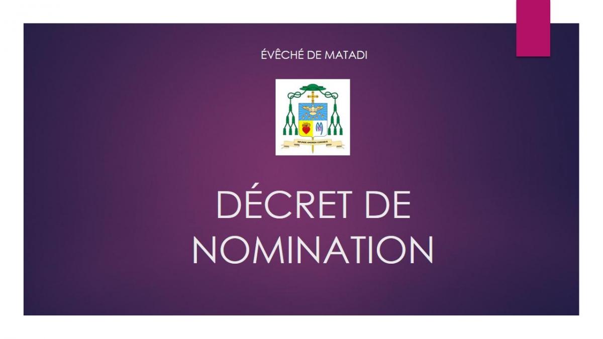 Nous rendons public le DECRET PORTANT NOMINATION A CERTAINS OFFICES, que Son Excellence Monseigneur André-Giraud PINDI, Evêque de Matadi, venait de signer.