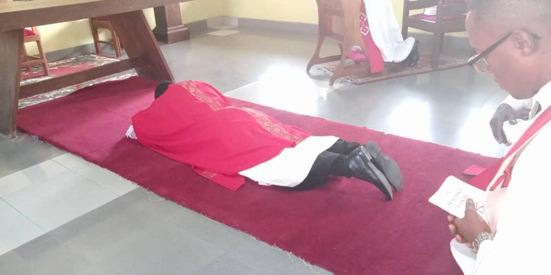 Ce vendredi 10 Avril 2020, Monseigneur Giraud Pindi, le Vicaire Général de notre Diocèse a célébré l'Office de la Passion de Notre Seigneur Jésus-Christ dans la chapelle de l'Evêché en présence de l'Evêque diocésain et de quelques confrères prêtres.